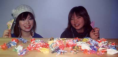 Kaori (on the right) and her friends from Aomori Koritsu Daigaku Emiko Kamiyama's LRR Room 312 folding cranes